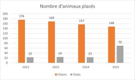 Au cours de l'année, 199 animaux ont été placés : 176 chiens et 23 chats.